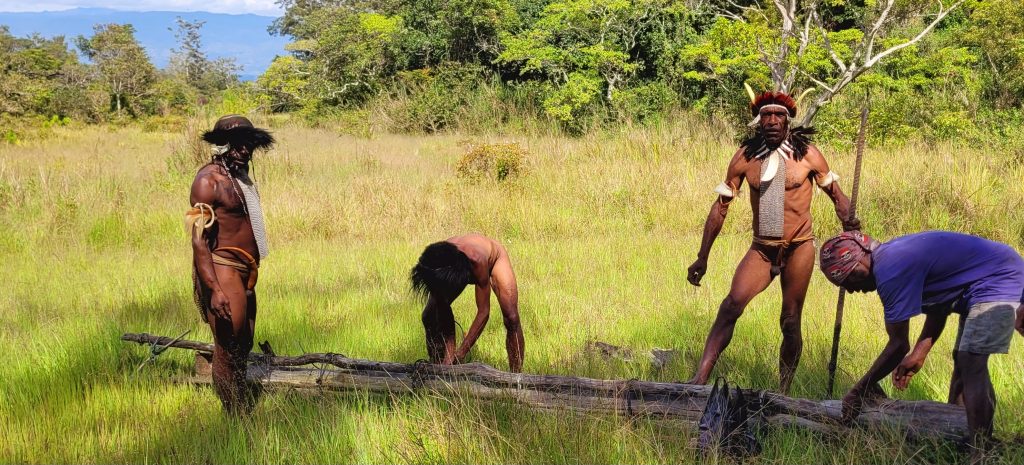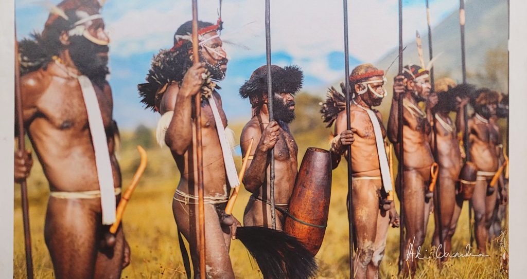 Dieses Tal wurde übrigens erst 1930 bei einem Überflug eher zufällig entdeckt, als die übliche Wolkendecke aufriss und der Pilot zu seiner Verwunderung landwirtschaftlich bestellte Ackerflächen erkannte – in einem Gebiet, in dem man sonst nur steinzeitliche Stämme auf Jäger-und-Sammler-Niveau erwartete.  Tatsächlich hatten die hier ansässigen Dani im flachen fruchtbaren Tal die Landwirtschaft unabhängig erfunden – ihre Kultur war gleichwohl steinzeitlich:  Palisadengeschützte Dörfer mit Kriegerstämmen, die sich gegenseitig befehdeten (und aßen);  die Frauen Oben-ohne in Baströcken, die Männer nur mit „Kotekas“ genannten Penis-Hüllen aus einer länglichen Kürbisfrucht bekleidet.