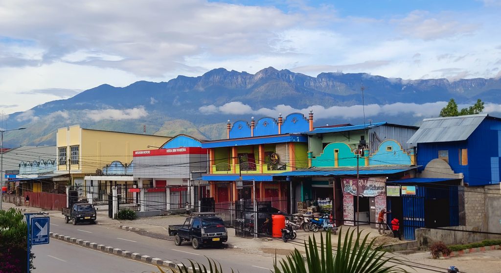 Timika, das Tor zu den südlichen Lowlands: Im Hintergrund ein selten freier Blick auf die Carstensz-Pyramide, dem mit knapp 4.900m höchsten Gipfel Ozeaniens