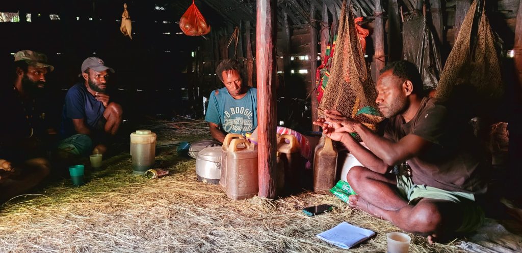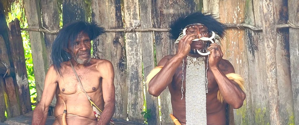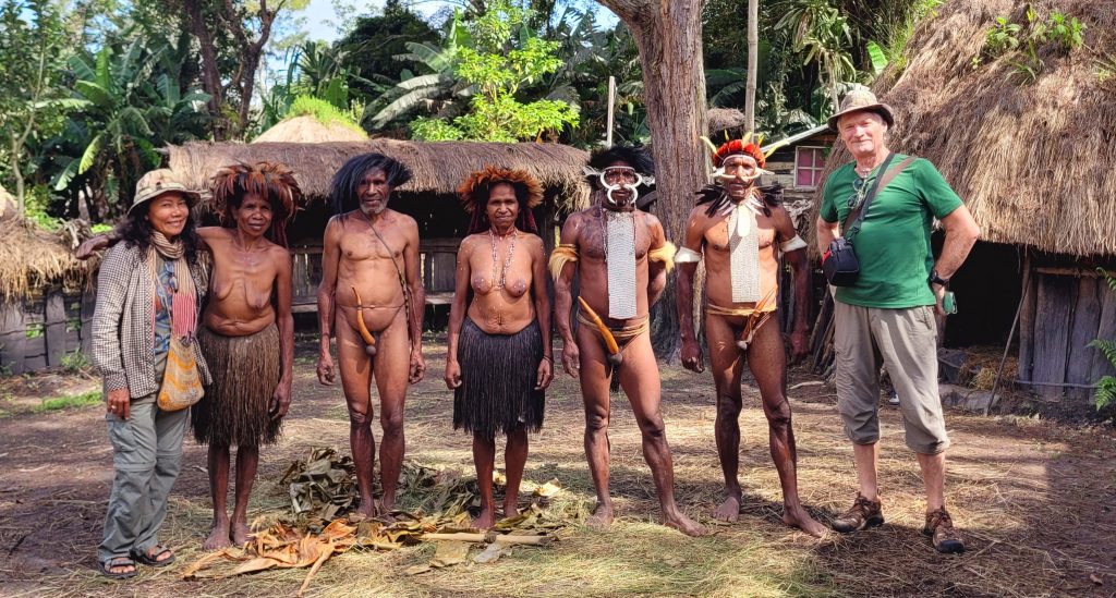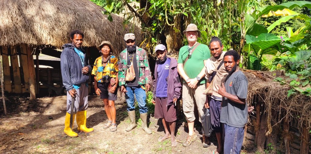 Auch die letzten Tage blieben spannend – am Samstag machten wir eine abschließende wunderschöne Wanderung an den Hängen des Baliem-Tals zu einem im Bergdschungel versteckten kleinen Dorf unter einer dräuenden Felswand.  In manchen Dörfern des Tals wird seit Jahrhunderten die Mumie eines einstigen heldenhaften Anführers verehrt – sie nimmt an allen wichtigen Ältestenratssitzungen teil.  Hier haben sie keine Mumie – aber einen Geist, der sie schützt, solange sie ihn angemessen ehren.  Dazu gehört, dass wir Fremden der Hütte, in der er wohnt, nicht zu nahekommen – was wir gern respektieren.  Dafür dürfen wir den Palisadenzaun übersteigen und werden ins Männerhaus eingeladen, um gemeinsam etwaige künftige Treffen zu besprechen: Mir wird bedeutet, dass das Dorf sich freuen würde, wenn es gelegentlich Besuch bekäme von den hier selten erscheinenden, gleichwohl offenkundig geschätzten weißen Aliens.  Es ist seltsam, wie schüchtern sie mir gegenüber sind – indonesische Migranten kennen sie, aber „richtige“ Weiße sind doch eine Rarität in ihrer Welt, und schlechte Erfahrungen (wie so oft andernorts) konnten sie mit uns glücklicherweise noch nicht machen.