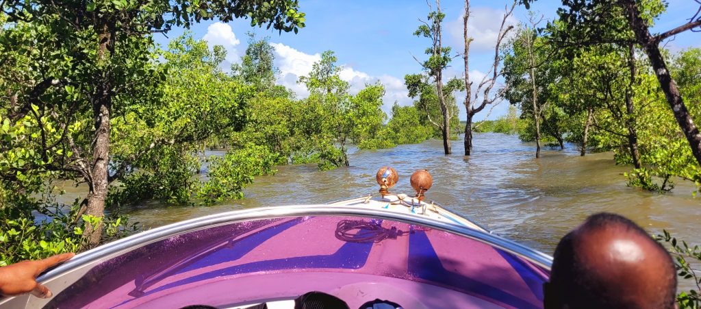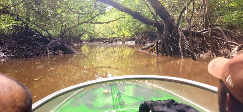 Abkürzung durch die Mangroven bei der flotten Fahrt von der Flughafeninsel..
