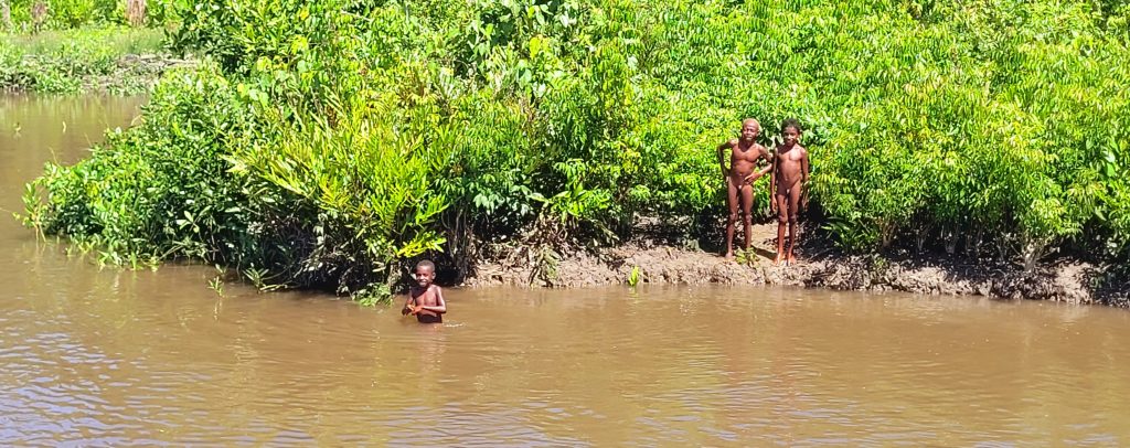 Der Bypass mündet in einen größeren Fluss, auf dem nun erst mal ordentlich Gas gegeben wird und wir die mäandernden Flussschlaufen durchschwingen.  Gelegentlich wird abgebremst, wenn wir ein Einbaum-Kanu mit fischenden Asmat passieren:  Sie grüßen stets dankbar freundlich herüber.  Nach zwei Stunden kommt das erste Asmat-Dorf in Sicht:  Ähnlich wie in Agats – nur noch sehr viel einfacher – stehen hier Hütten und Holzstege auf Pfählen im sumpfigen Mangrovenschlick.  Die im Wasser spielenden Dorfkinder sind die ersten, die unsere Ankunft bemerken und sammeln sich neugierig um uns, dann erscheinen auch Erwachsene sowie eine indonesische Ärztin, mit denen unser Guide einige Worte wechselt.  Da die Kids bei unserer Ankunft im Wasser tobten, sind sie zumeist nackt – die Erwachsenen in Shorts und T-Shirts aus Kleidersammlungen gekleidet.  Wir werden ins Langhaus begleitet, in welchem sich gefühlt bald der ganze Stamm versammelt hat – wir sitzen alle auf dem Boden, die Ältesten uns direkt gegenüber, und unser Guide erklärt unser Begehr:  Wir würden uns gern ein wenig im Dorf umsehen und auch schauen, wo man mit Gästen evtl. übernachten könnte.