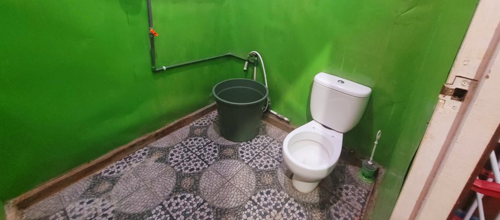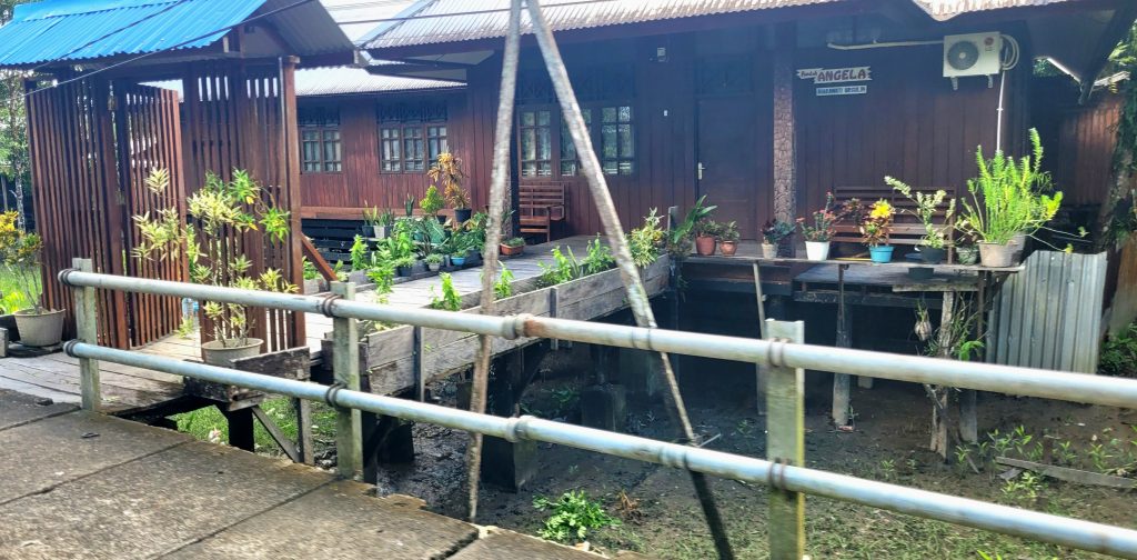 Schließlich eine Überraschung:  Mitten im Dschungel hat sich aus einem ehemaligen Militärposten ein kleiner Versorgungsstandort entwickelt, mit indonesischen Transmigranten, die einige Läden und Warungs führen, sowie einem kleinen aber feinen Hotel (!):  Ich bin glücklich, eine einfache, aber doch anbietbare Schlafgelegenheit für uns und auch für Gäste gefunden zu haben – die Zimmerchen haben sogar jeweils eine kleine Nasszelle/Toilette!!