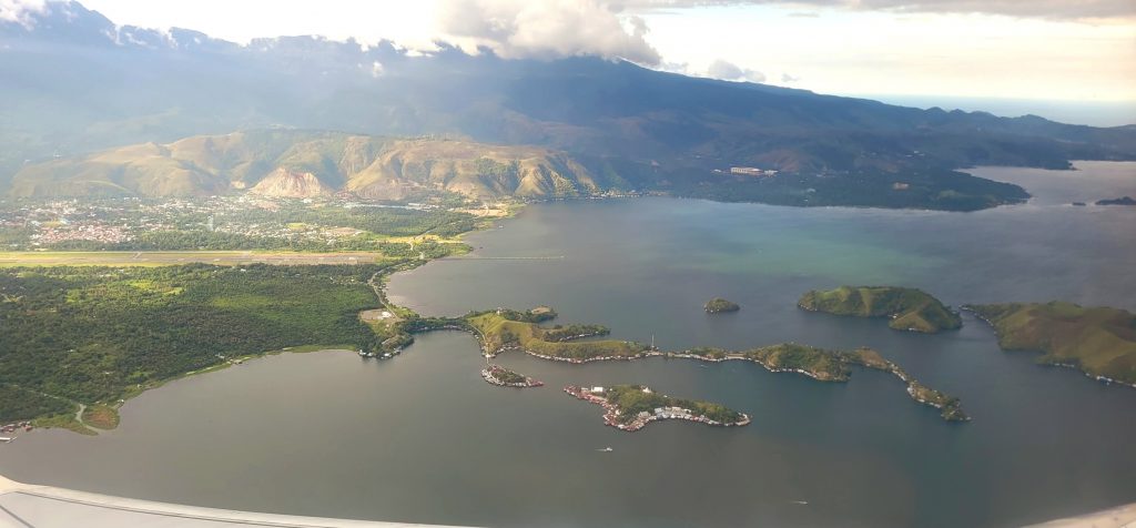 Links mittig taucht das von den Amis im WWII hier in den Dschungel geklotzte Flugfeld auf – zwischen diesem und dem dahinter erkennbaren McArthur-Hügel (Kommandozentrale des damaligen Ami-Befehlshabers) hat sich der geschäftige Stadtteil Sentani entwickelt, während die Papua weiterhin ihre Pfahlhäuser am Seeufer bewohnen