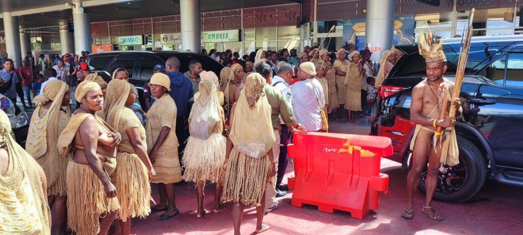 Ein ganzer Stamm in Tracht erwartet am Flughafen einen kirchlichen Würdenträger (er war wohl grad bei der Papstwahl in Rom)