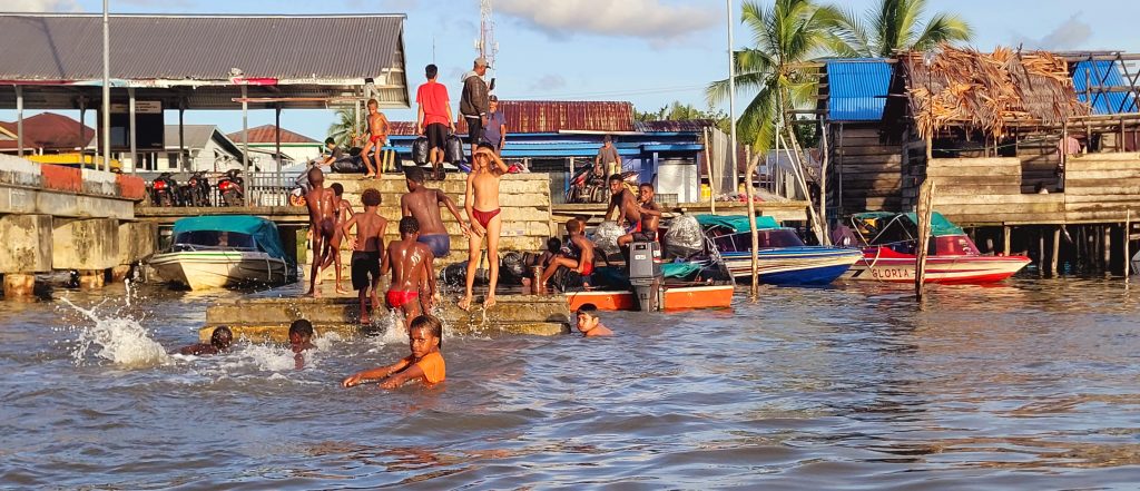 Dieses Städtchen wird von Transmigranten  – also von der indonesischen Regierung hierher befohlenen Bewohnern anderer indonesischer Inseln –  bewohnt: Auf diese Weise versucht die Regierung, die melanesischen Papua im eigenen Land zu marginalisieren, indem sie Bewohner anderer, teils übervölkerter Inseln hierher umsiedeln lässt und so die Mehrheitsverhältnisse ändert. Papua kommen in solchen Wildwest-last-frontier-Städtchen nur als Bodensatz betelnusskauender Gelegenheitsarbeiter vor, die zwischen ihren Urwalddörfern und der Stadt pendeln. Die ganze Stadt (Häuser, Straßen, Stege, Wege) ist auf Stelzen in den Mangrovenschlick gebaut – bei Flut steht sie im Wasser. Autos gibt es keine (dafür wären die Stege auch zu schmal), aber enorm viel Motorroller. Die wiederum hier ALLE elektrisch fahren – es gibt daher keinen Verkehrslärm, was das Laufen einerseits verkompliziert, da die lautlosen Flitzer von hinten kommend nicht wahrgenommen werden. Andererseits ist man ausgerechnet in diesem abgelegenen und für seine angeblichen „Steinzeitmenschen“ bekannten Winkel der Welt der (elektrischen) Zukunft bereits erstaunlich nahe.