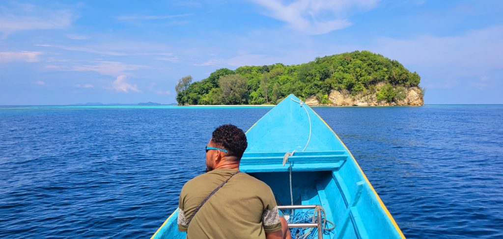 Mit dem Longboat durch den Raja Ampat Archipel vor Neuguineas Vogelkopf-Halbinsel..