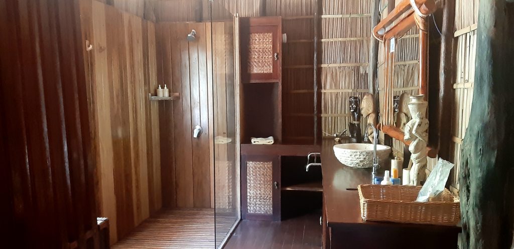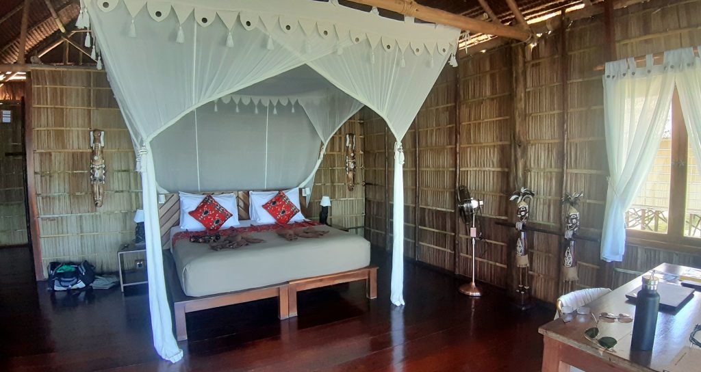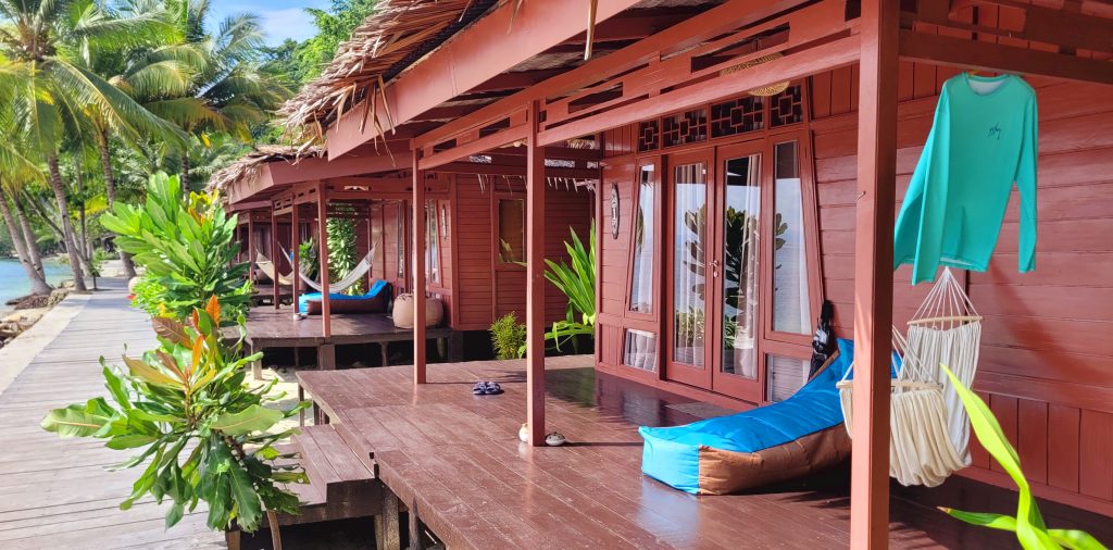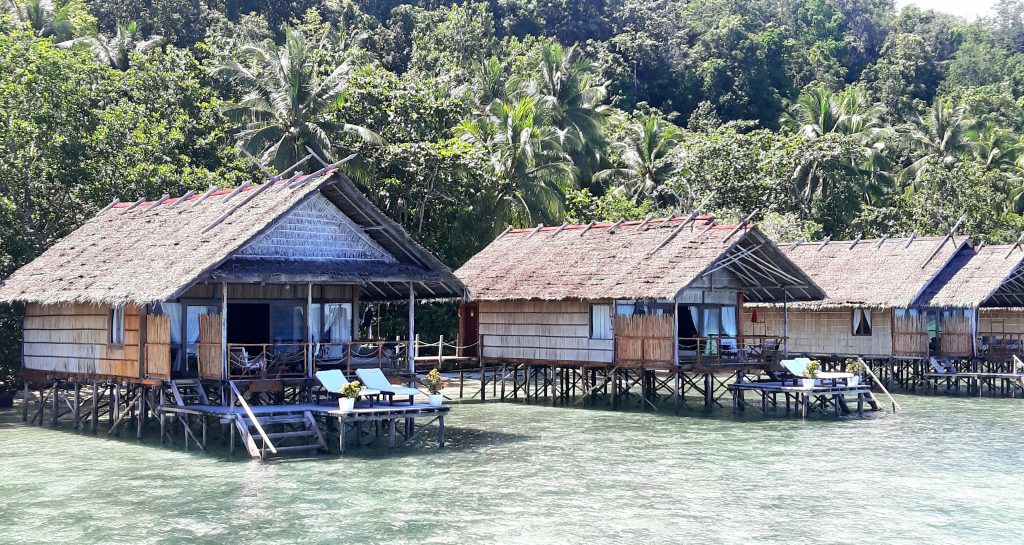 Ganz anders die (sehr wenigen) Highend-Resorts: Bungalows im einheimischen Stil oder als festes Holzhaus, aber geräumig und wertig eingerichtet, mit privatem Badezimmer vom Feinsten, oft mit Klimaanlage – hier wird mindestens Englisch, teils sogar Deutsch gesprochen und das Tauch- und Schnorchel-Equipment ist gepflegt, alles perfekt organisiert.  Sehr teuer – aber auch nicht verwunderlich angesichts der Herausforderungen, einen solchen Betrieb in dieser Abgeschiedenheit und unter diesen klimatischen Bedingungen aufrecht zu erhalten.